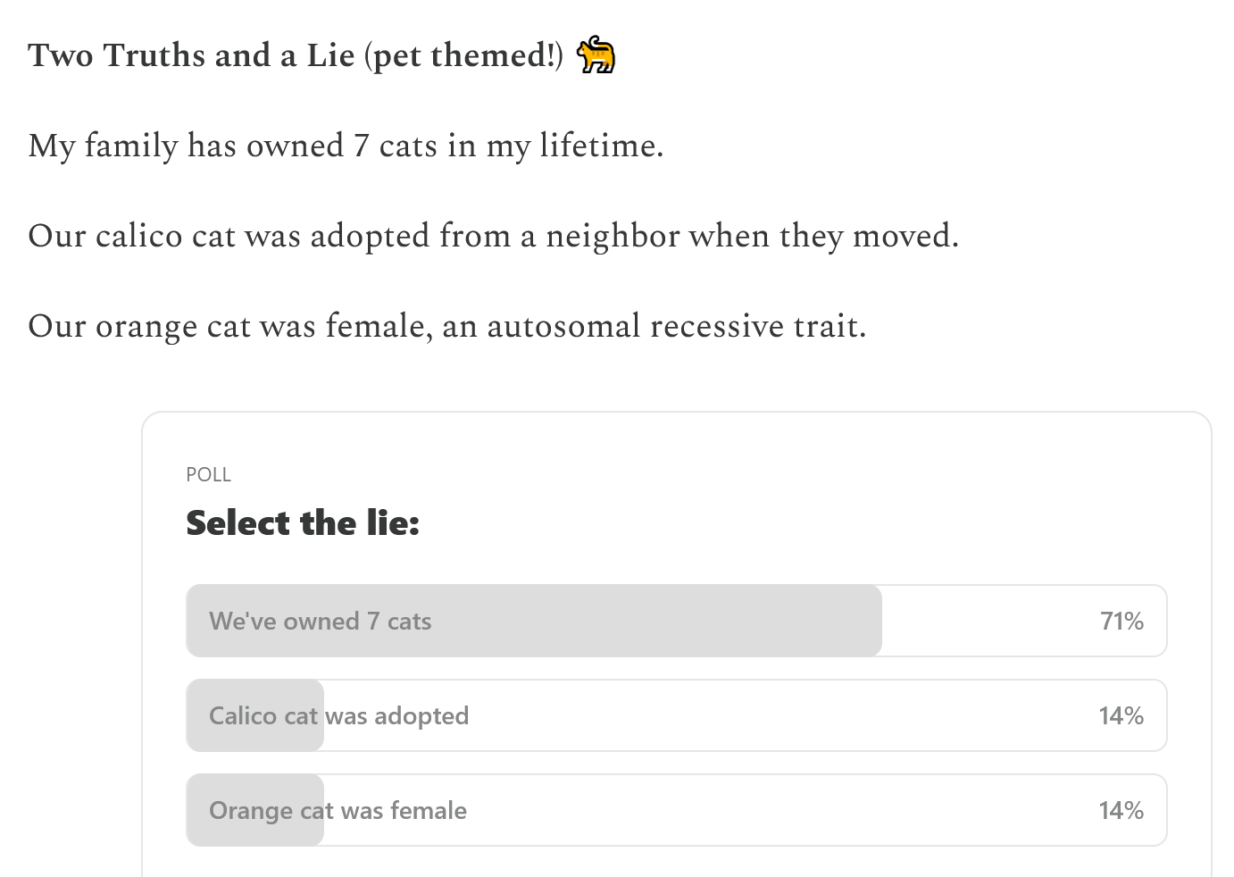 The answers to last month’s truth and a lie tells me you severely underestimate my love for cats. The lie is actually #2, we’ve never owned a calico or adopted a cat from the neighbors.