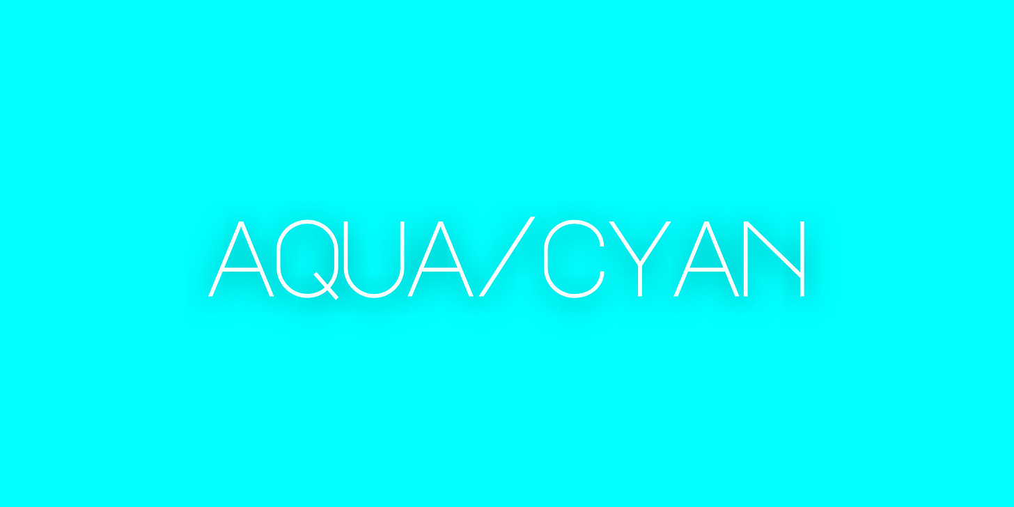 Aqua, on the other hand, is even more bright than turquoise. It is also known as cyan. (And yes, this is where we get the word cyanide, because one of the compounds in cyanide is blue.)