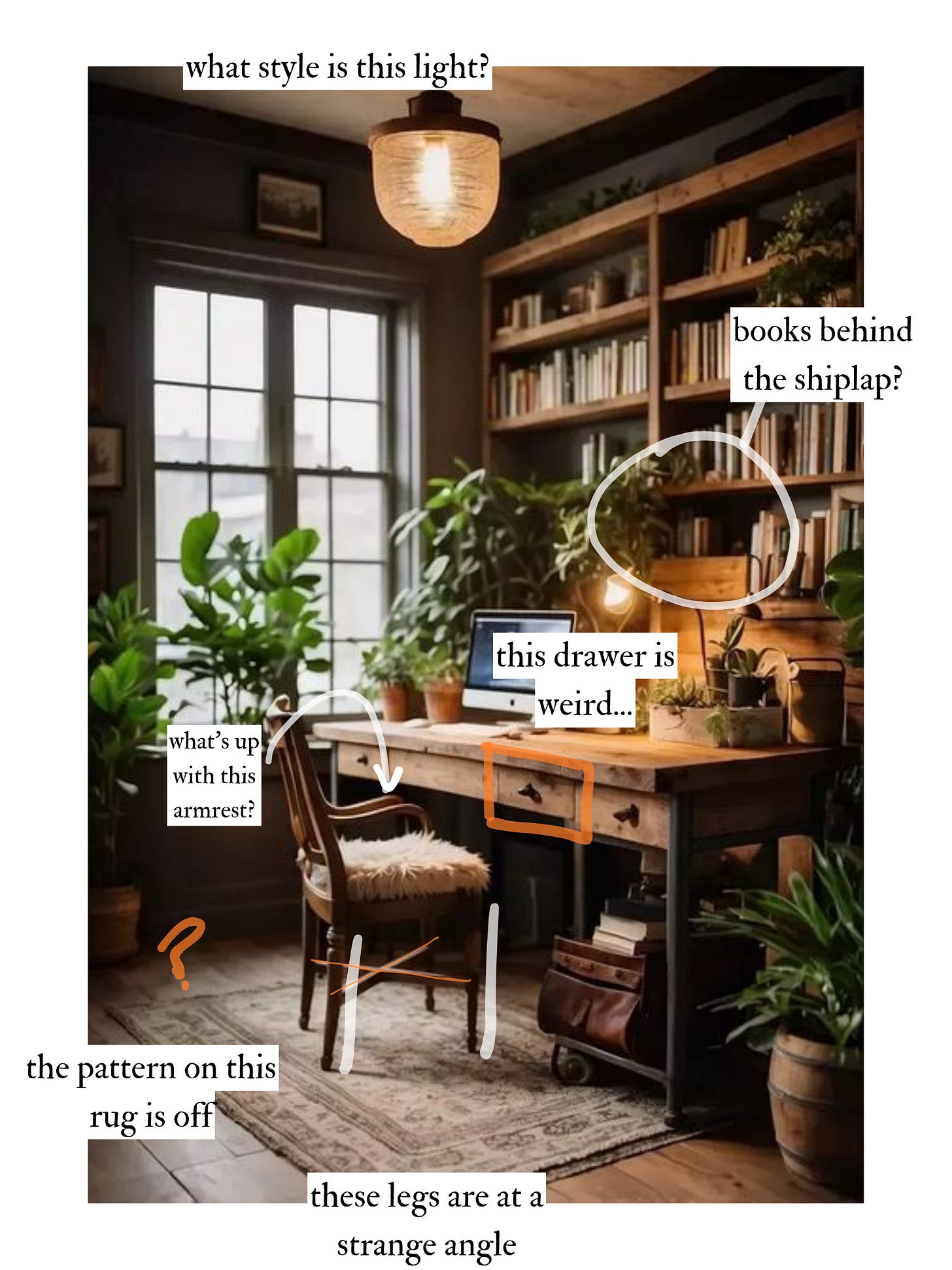 While the armrests are the only technical mistake AI made in this picture, we can see a few other issues. AI has no concept of tradition when it renders traditional looking furnishings, for example, how chair legs are historically made or different styles of light fixtures. It has no idea how things are made, for example, when it depicted a custom built-in bookshelf that wastes a ton of space. The AI has no concept of something being on the other side of that wall, unlike a human familiar with living in a house. And it has no idea how things are used, since it boards in books on a shelf.