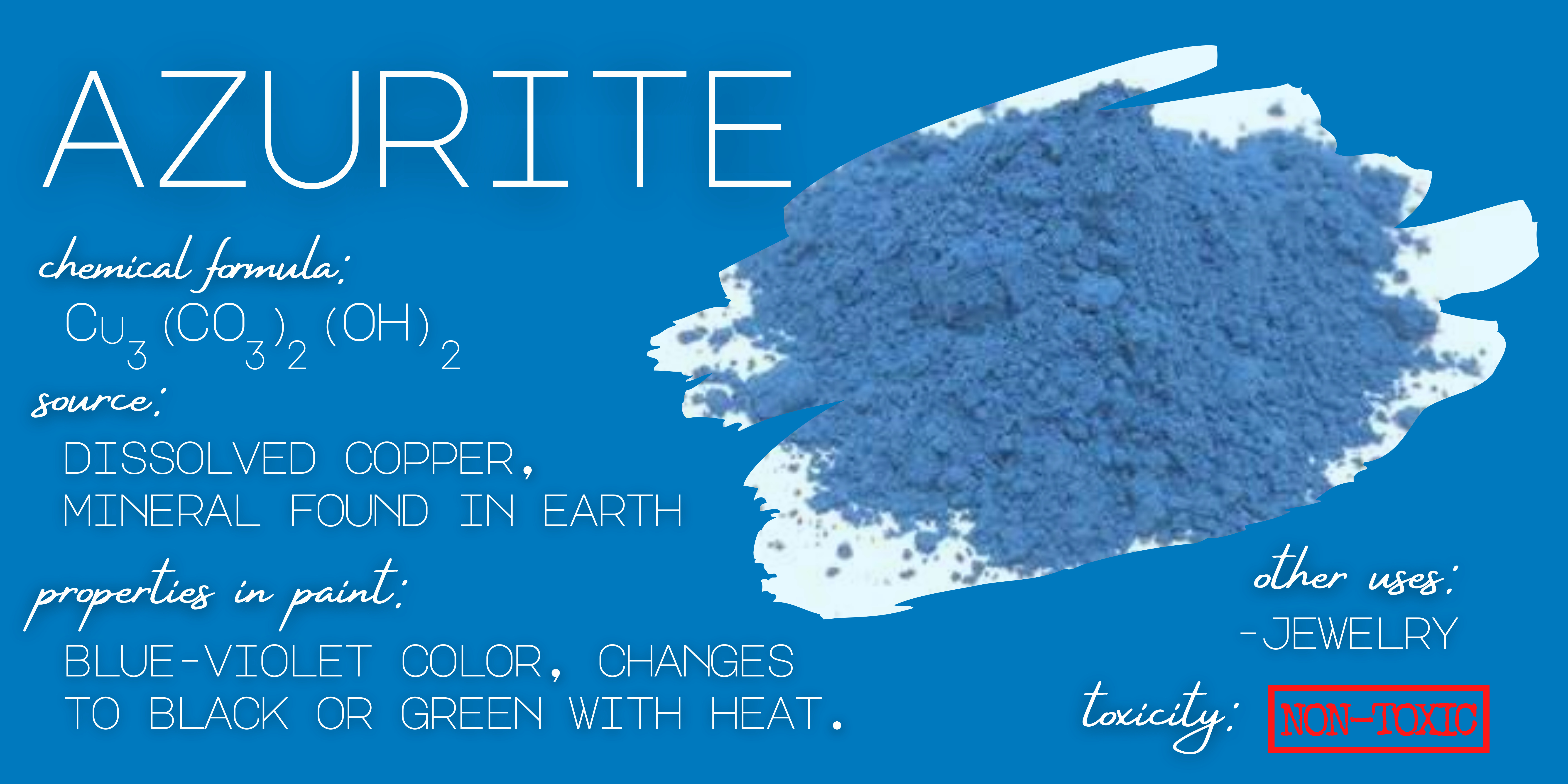 This pigment was formed from minerals found in Germany, France, and Italy. It was more affordable, although not as vivid, as ultramarine. Azurite turns green or black with heat and time, which means many paintings that used it now look different than when they were first painted. The word "azure" is an English version of the Persian word for "blue."