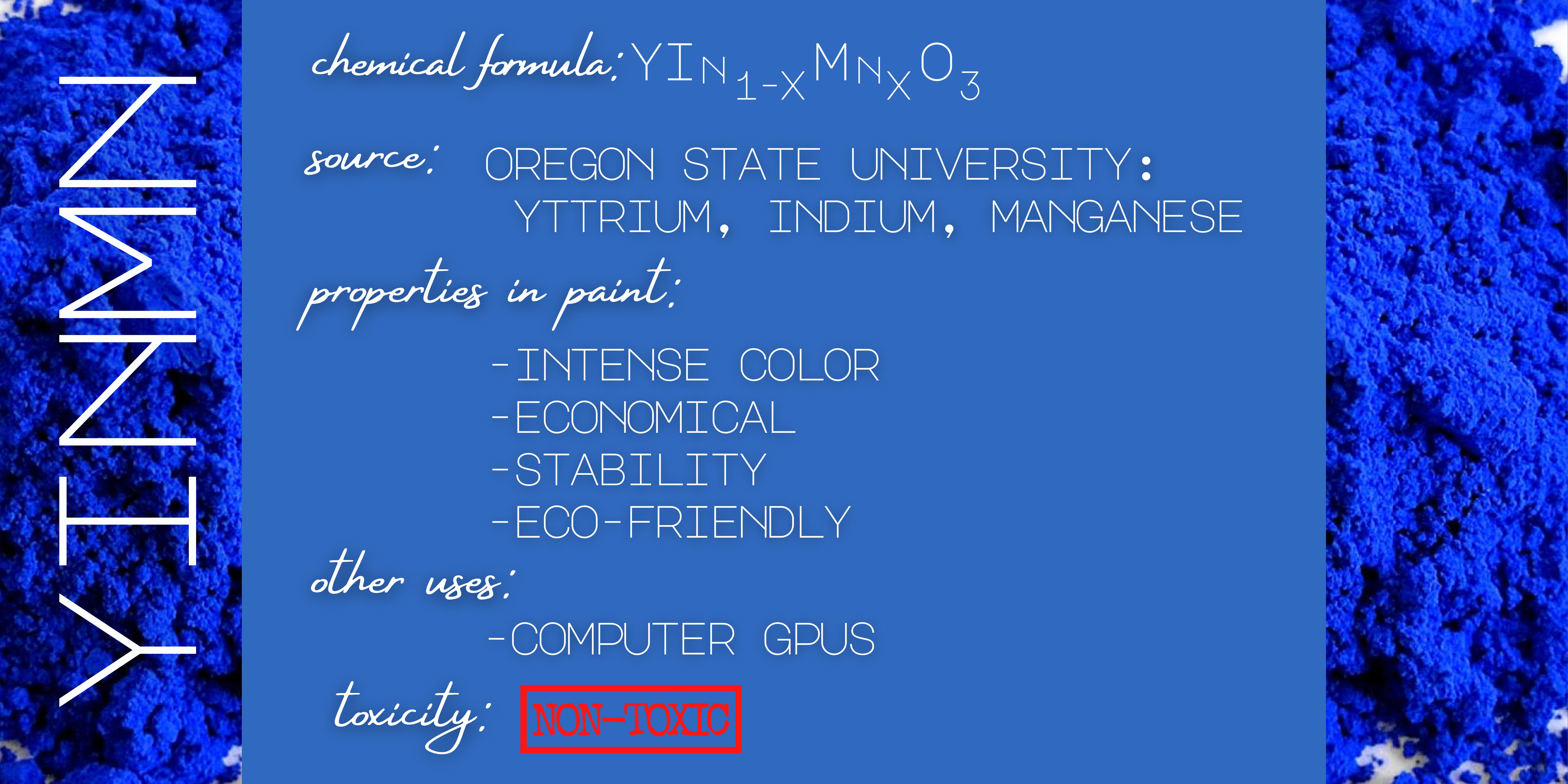 This is the most recent blue to date, discovered in 2009 by a professor and student at Oregon State University as the side result of a electronics-focused science experiment. The name comes from the elements --yttrium, indium, and manganese-- that make up the pigment. In addition to being used by artists from Oregon and elsewhere, it also has cooling properties and will likely be used commercially in the future.