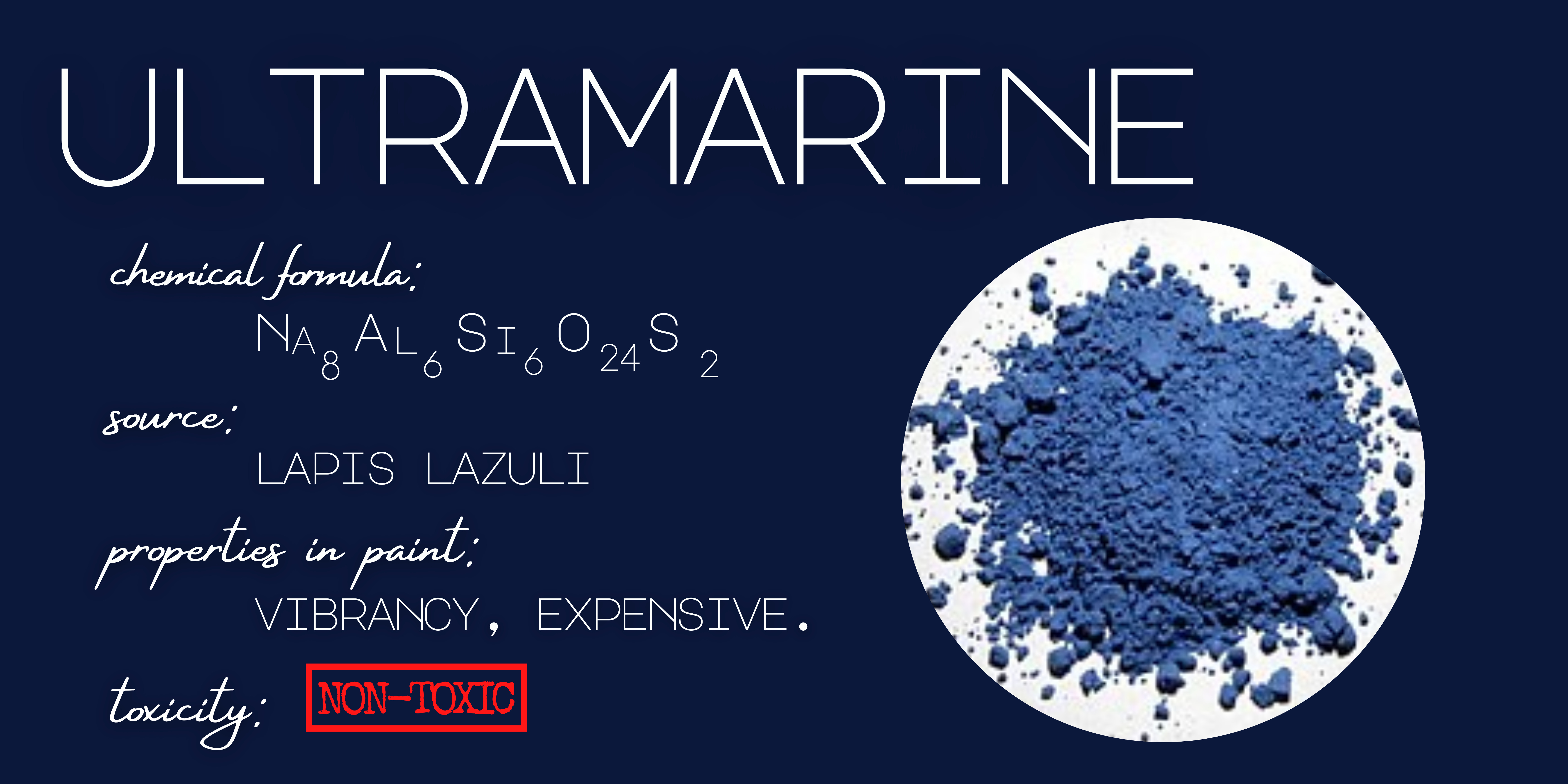 Ultramarine translates to "beyond the sea." It's a rich blue color that comes from lapis lazuli (translates to "blue stone") which was mined in what is now current day Afghanistan. During the medieval period, it was worth more than its weight in gold, due to its rareness and the labor intensive process used to turn the stone into paint. It was often used in religious paintings for the robes of the Virgin Mary, because the Catholic church held her as highly venerated. In the Last Supper, Leonardo DaVinci used ultramarine when painting Christ's robes, however, he used a cheaper pigment for Judas's blue clothing, called azurite.