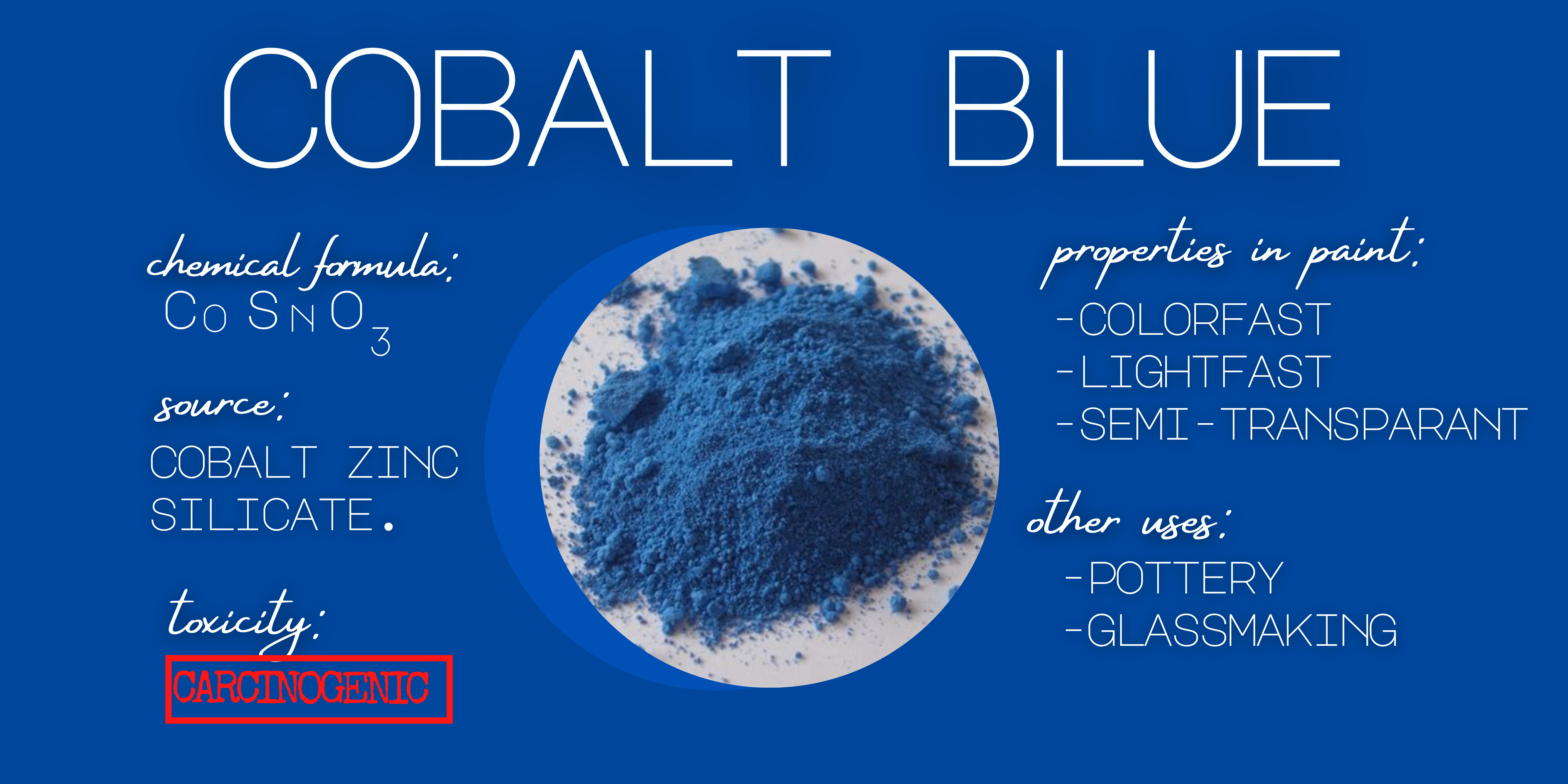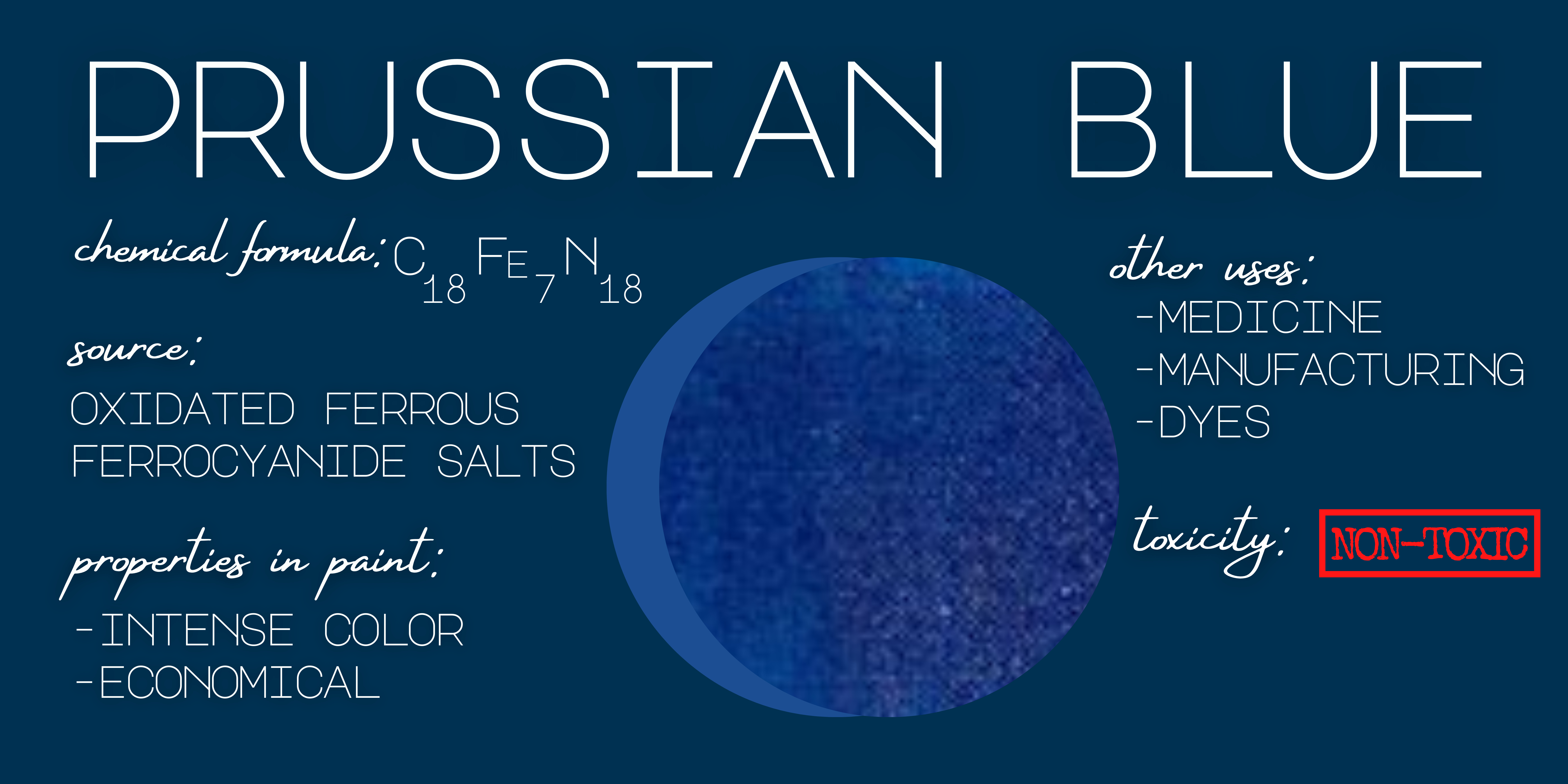 Prussian blue is a synthetic pigment that was discovered on accident. Dyemaker Johann Jacob Diesbach was working on-- you won't believe it-- a new red dye. One of his ingredients became contaminated with blood (animal blood) however, the dye underwent a chemical reaction and became a very commonly used blue. This is the blue that Picasso used during his blue period. This blue is also the blue used in making architectural blueprints.