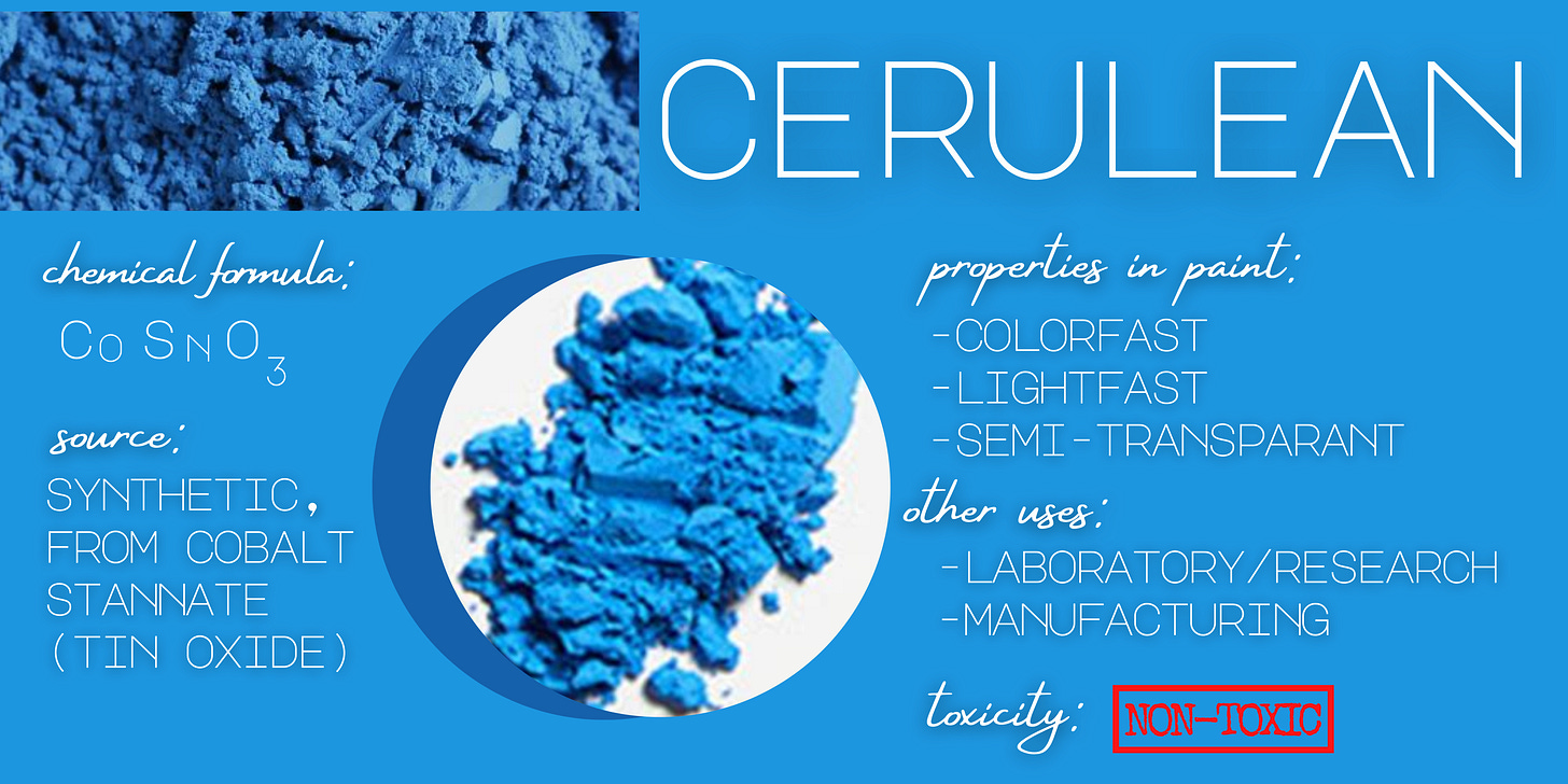 "Cerulean" is a beautiful word that simply rolls off the tongue, and it comes from the Latin for sky, or heaven. The color it represents is also beautiful: a calming blue that is, naturally, used for painting the sky, among other things. Cerulean blue was discovered in 1805, three years after cobalt blue was invented, but didn't become commercially available until 1860.